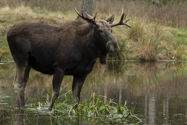 Emil står i en spegelblank damm, drickande vatten som rinner från hans mun, vilket skapar en harmonisk rörelse. Bildens komposition och ljus framhäver älgens majestätiska närvaro, vilket imponerade juryn.