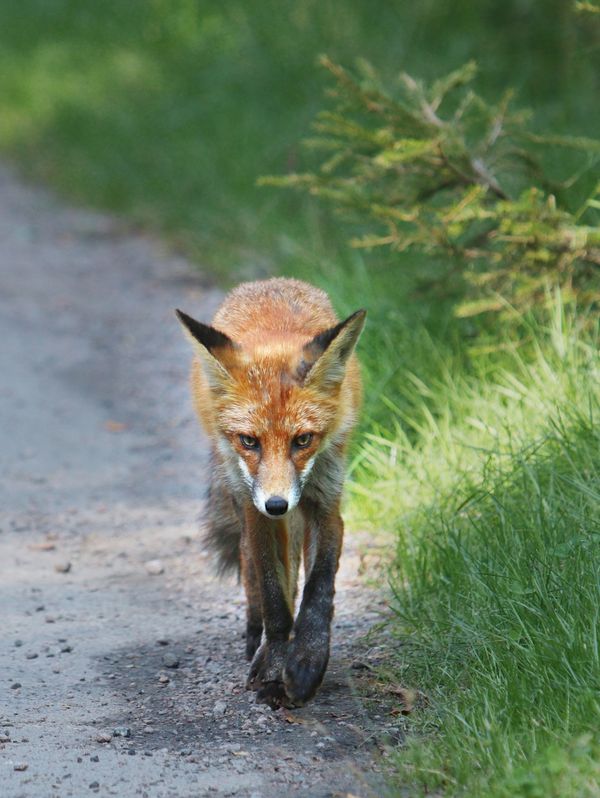 Bilden fångar rävens eleganta, raka gångstil och dess intensiva blick, fullt fokuserad på jakten. I parken finns många gnagare och andra däggdjur, perfekta byten för räven. Parkens många safarivägar erbjuder utmärkta smygvägar, vilket gör området idealiskt för jakt.